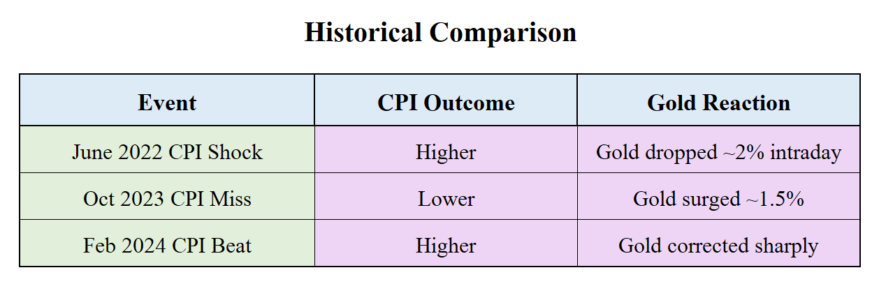 If traders are heavily positioned long on gold before CPI, a bearish surprise (higher CPI) can trigger rapid selling. This unwinding of positions amplifies downside momentum, often causing sharp and quick drops in XAUUSD due to stop-loss triggers and algorithmic trading.