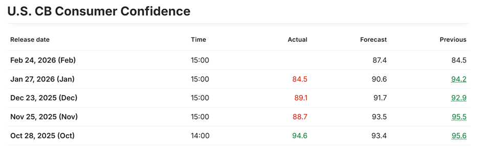 Markets are positioning ahead of today’s 15:00 GMT release of US Consumer Confidence data from The Conference Board. Our outlook anticipates stronger-than-expected confidence, combined with easing geopolitical escalation involving Iran and a hawkish tone from a Federal Reserve member.