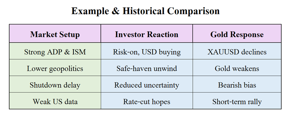 Gold (XAUUSD) is trading with a bearish bias ahead of key US macro releases scheduled for 13:45 GMT (ADP Employment) and 15:00 GMT (ISM data). While the data is not released yet, expectations of strong US economic readings, combined with lower geopolitical tension and an extension of the US government shutdown deadline to 13 February 2026, are reducing near-term demand for gold.