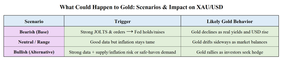 With today’s “good” JOLTS and factory orders, the likely base case: markets push the Fed into a wait-and-see/hawkish stance. That typically elevates U.S. real yields and the dollar, creating headwinds for gold. XAU/USD may drop from current levels, retesting support zones. However, if the strong data hint at overheating, supply constraints or geopolitical risk amplify, gold may pivot and rise as a hedge. In short: good data can hurt gold, but context matters.