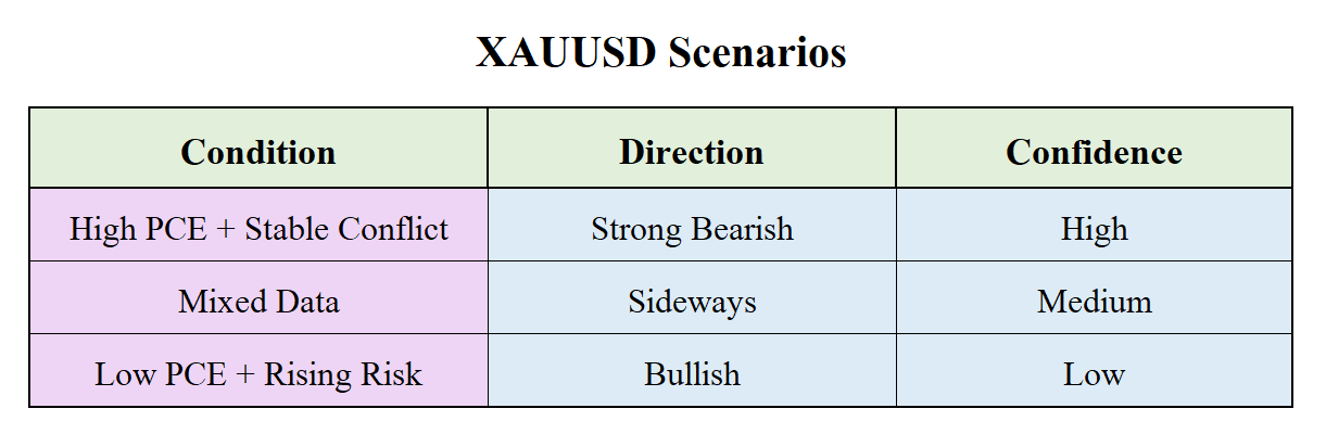 As markets await the US PCE inflation data (12:30 GMT), gold (XAUUSD) is facing downside risk based on two key assumptions: higher-than-expected PCE inflation and renewed tensions from US–Iran ceasefire violations.
