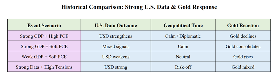 Strong GDP but softer PCE (or vice versa) may keep gold trading sideways, as markets reassess the Fed’s policy outlook.