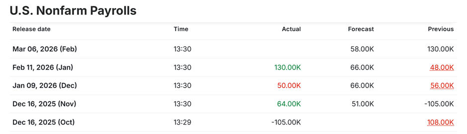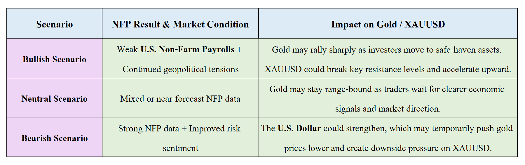 The U.S. Non-Farm Payrolls report is one of the most influential economic indicators for financial markets. A weaker-than-expected jobs report typically signals slowing economic growth. This often increases expectations that the Federal Reserve may adopt a more accommodative monetary stance, which can weaken the U.S. Dollar and support higher gold prices.