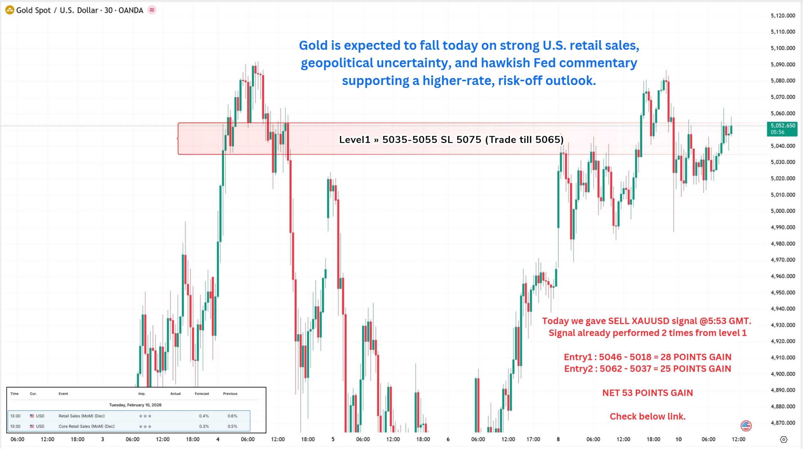 Gold (XAUUSD) often reacts to macro data and risk sentiment. On 10 February 2026, three major themes could push prices lower — at least initially — once the US Retail Sales report is released: