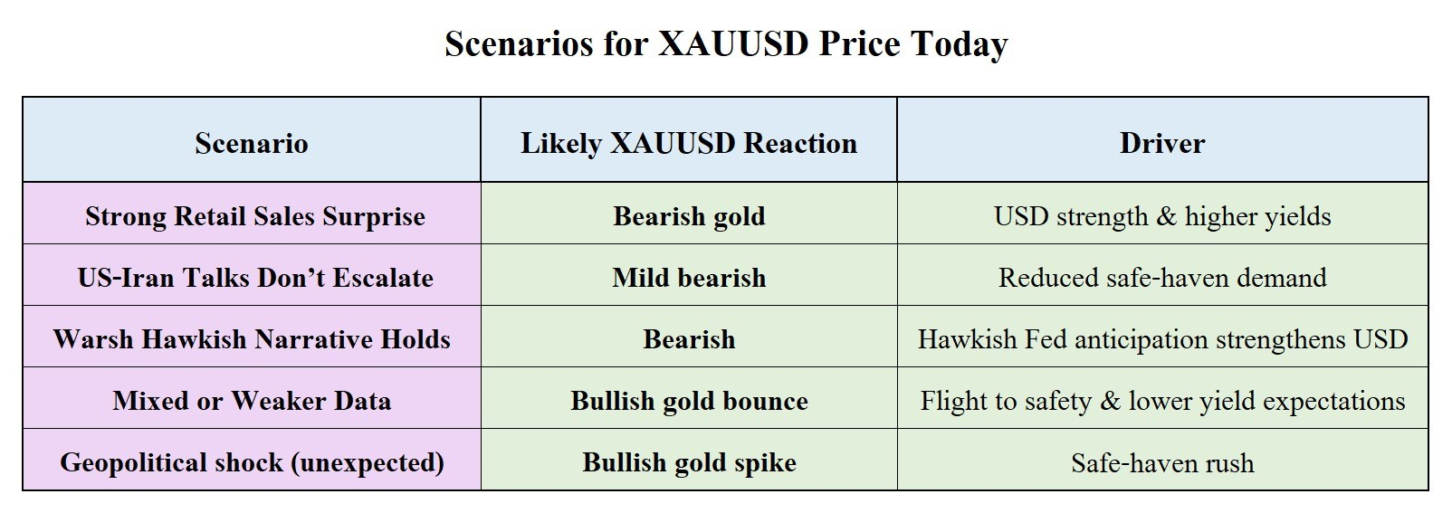 old (XAUUSD) enters today’s US session at a critical crossroads as markets await the US Retail Sales release at 13:30 GMT. Expectations of strong consumer data, easing US-Iran tensions, and a potentially more hawkish Federal Reserve stance are shifting risk sentiment toward the US Dollar. Together, these factors could reduce safe-haven demand and apply downside pressure on gold prices in the near term.