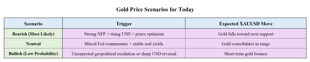 Gold (XAUUSD) is under pressure today as a combination of strong US Non-Farm Payrolls (NFP) and renewed Ukraine–Russia peace talk optimism pushes safe-haven demand lower. The market is reacting to two major forces: